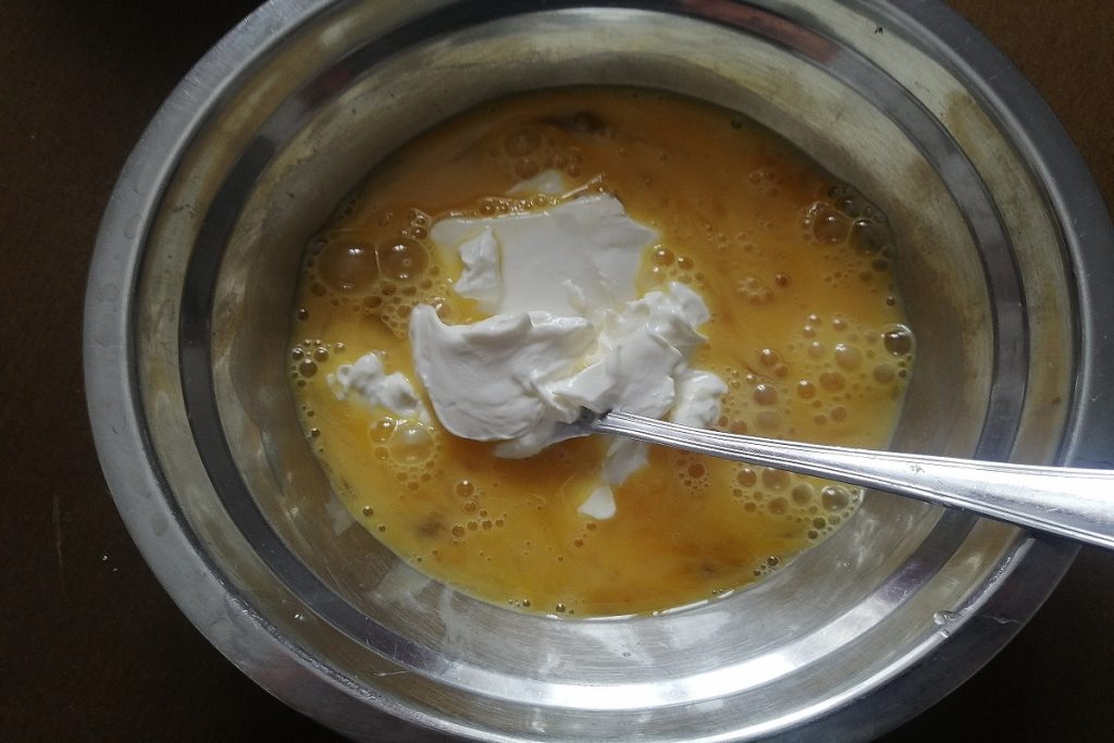 Wir schlagen die Eier auf und verquirlen sie.