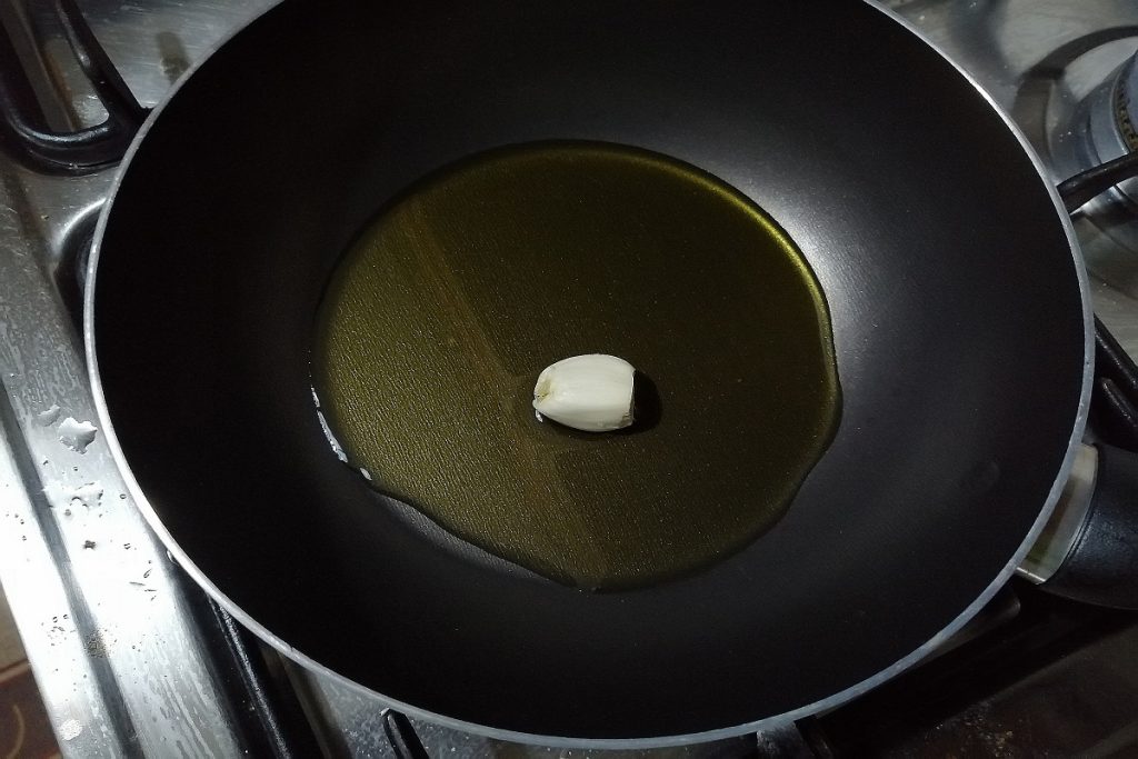 In einer Pfanne geben wir etwas Olivenöl EVO und eine Knoblauchzehe, dann fügen wir das Kürbisfleisch hinzu.