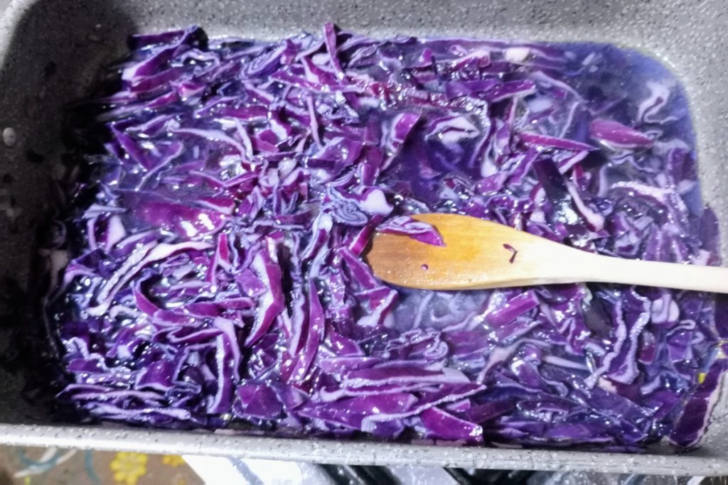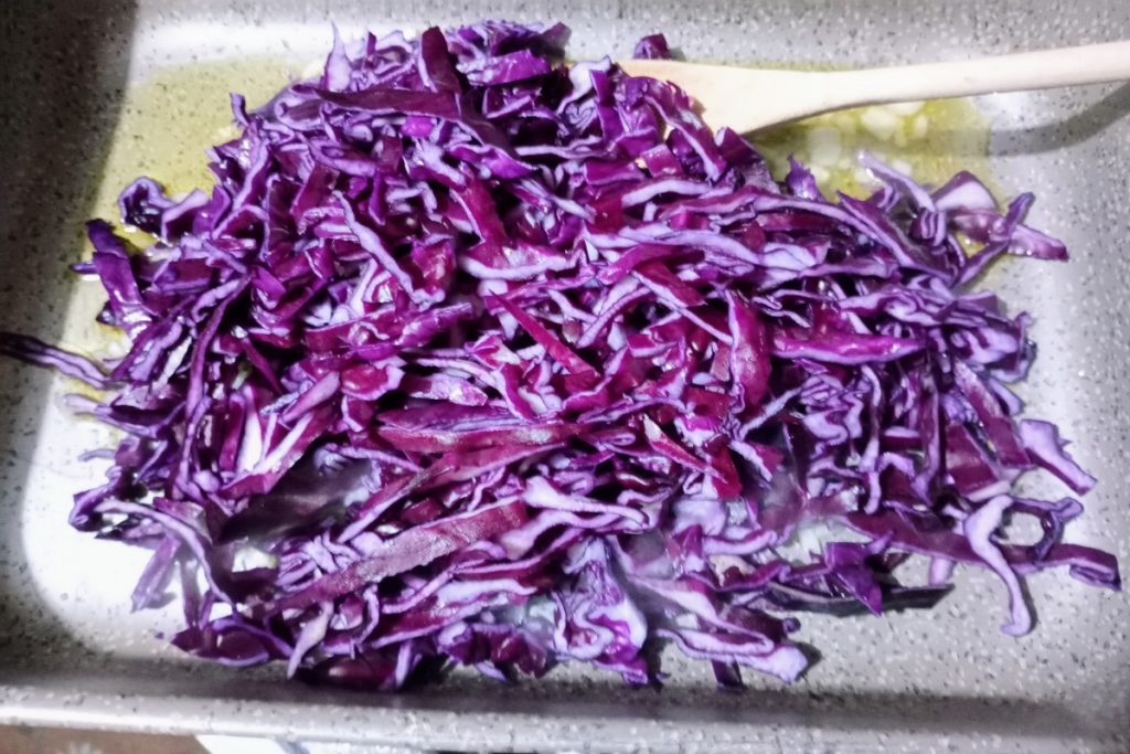 Zuerst den Rotkohl schneiden und die härteren weißen Teile entfernen, in feine Streifen schneiden und unter Wasser abspülen.