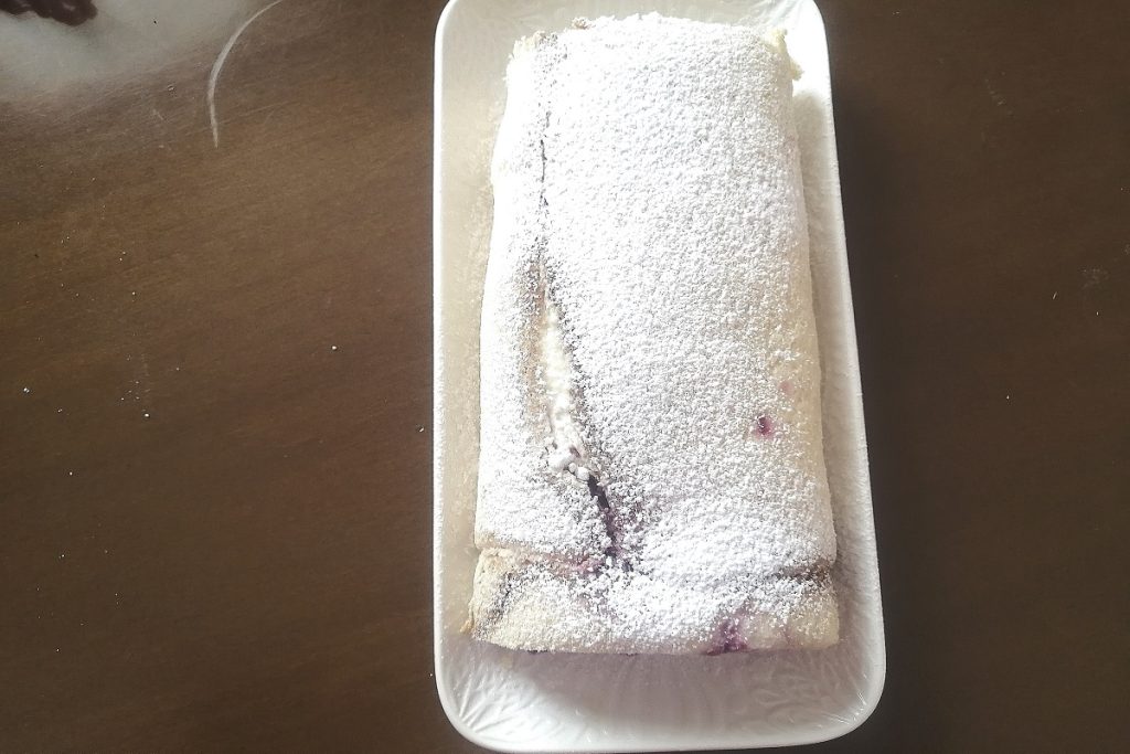 • Die Rolle auf eine Servierplatte legen und mit Puderzucker bestäuben.