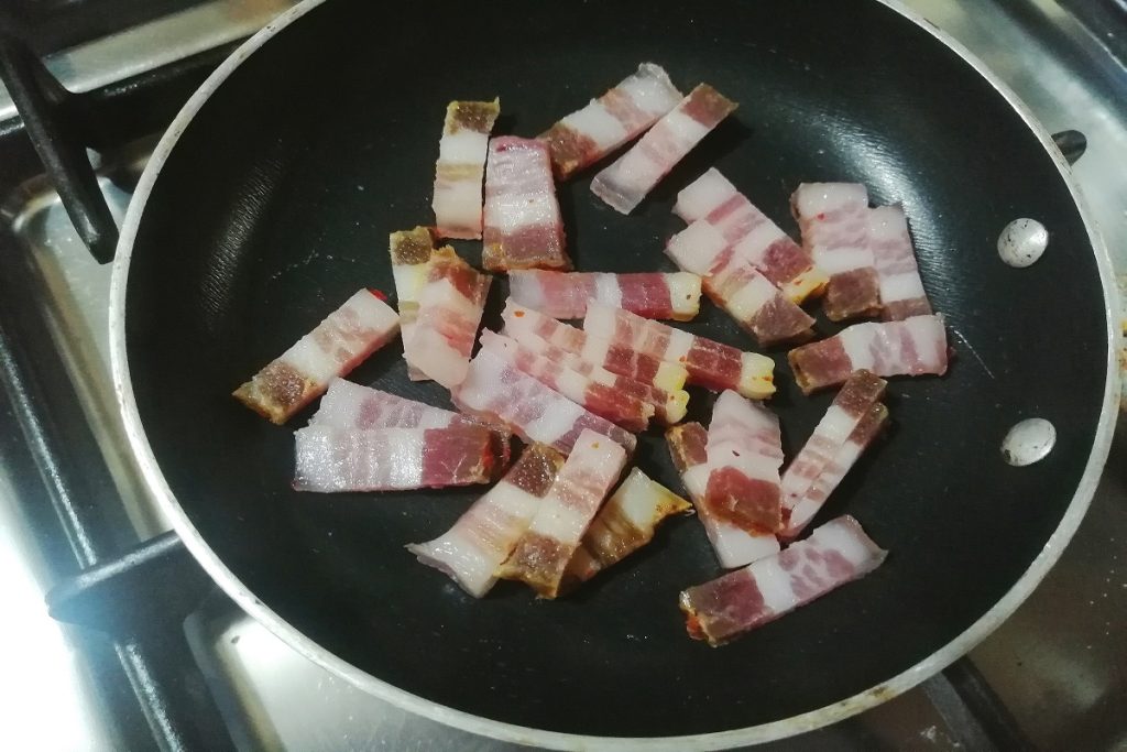 Nehmen Sie eine antihaftbeschichtete Pfanne und geben Sie den Speck hinein, braten Sie ihn ohne Öl an, bis er goldbraun und knusprig ist.