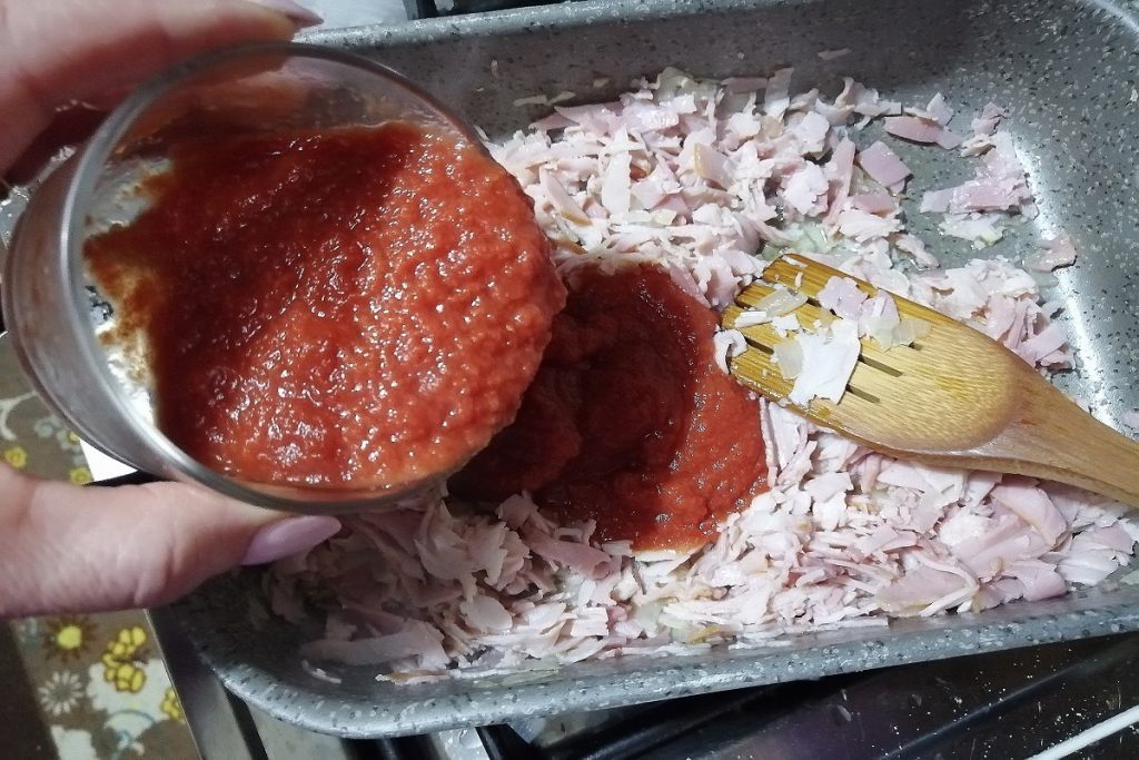 Wir fügen den gekochten Schinken hinzu und lassen ihn ein paar Minuten unter Rühren anbraten.