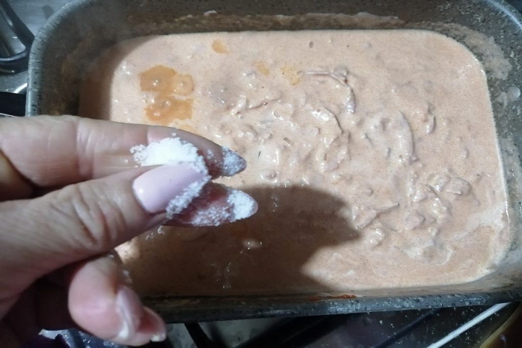 Wir fügen das Tomatenpüree, die Sahne hinzu und rühren um.
