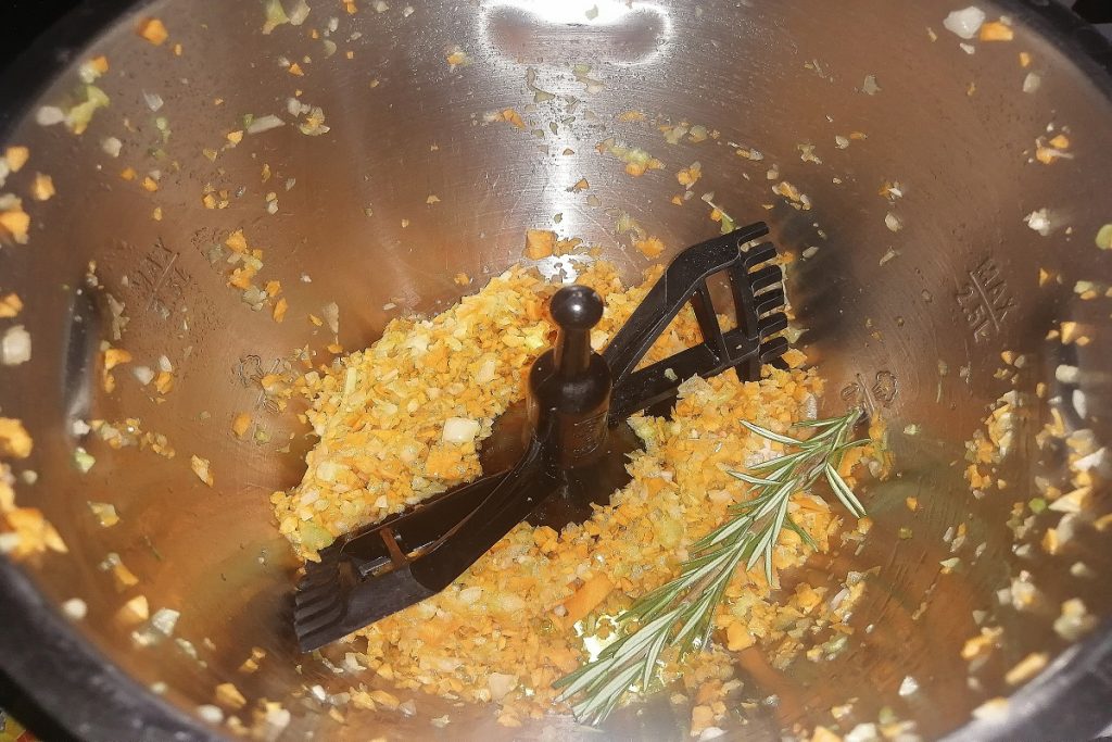 Wenn Sie keinen Küchenroboter zum Kochen haben, geben Sie das gehackte Gemüse in einen Topf, fügen Sie den Rosmarinzweig und das EVO-Öl hinzu und braten Sie es bei mittlerer Hitze für ein paar Minuten unter Rühren an.