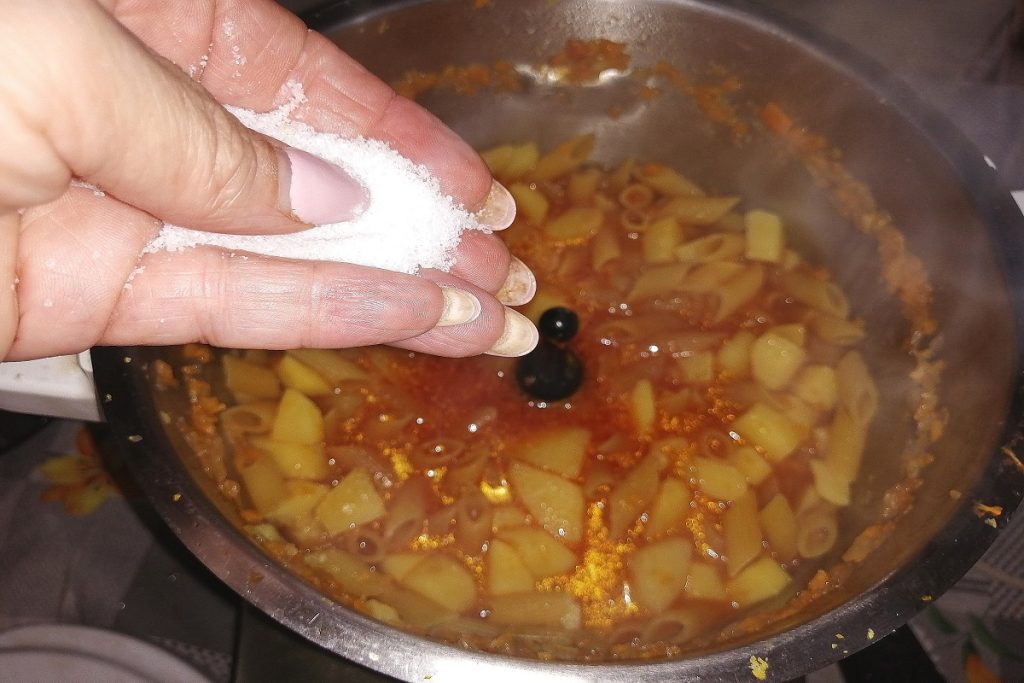 Nach dieser Zeit fügen Sie die Pasta hinzu, schmecken Sie mit Salz ab und lassen Sie sie nach der auf der Verpackung angegebenen Zeit kochen. Wenn die Kartoffeln trocken erscheinen, fügen Sie etwas heißes Wasser hinzu. Das Endergebnis sollte cremig und nicht suppig sein.