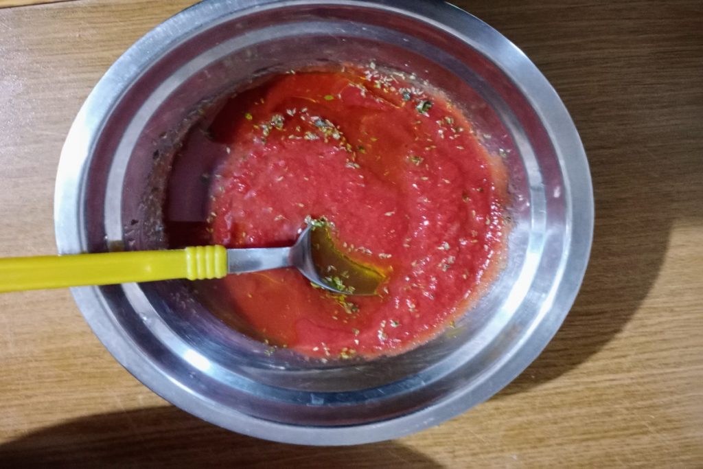 In einer Schüssel geben wir die Tomatensoße und würzen sie mit Salz, Öl und Oregano.