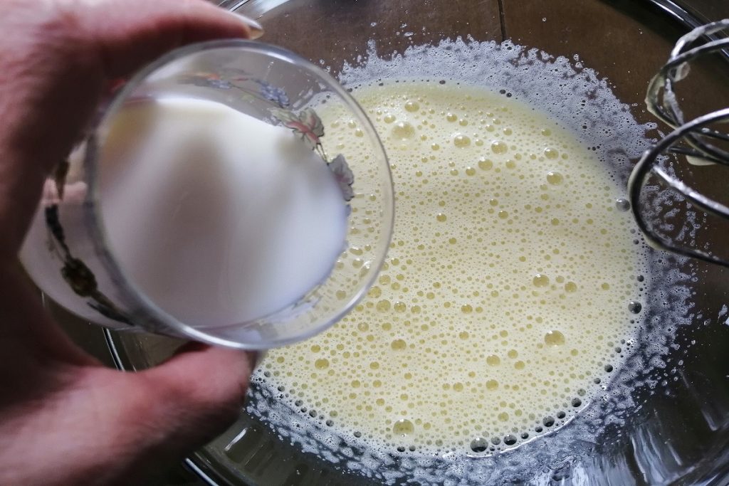 Fügen Sie die Milch, das Öl und nach und nach das gesiebte Mehl, vermischt mit dem Backpulver, hinzu.