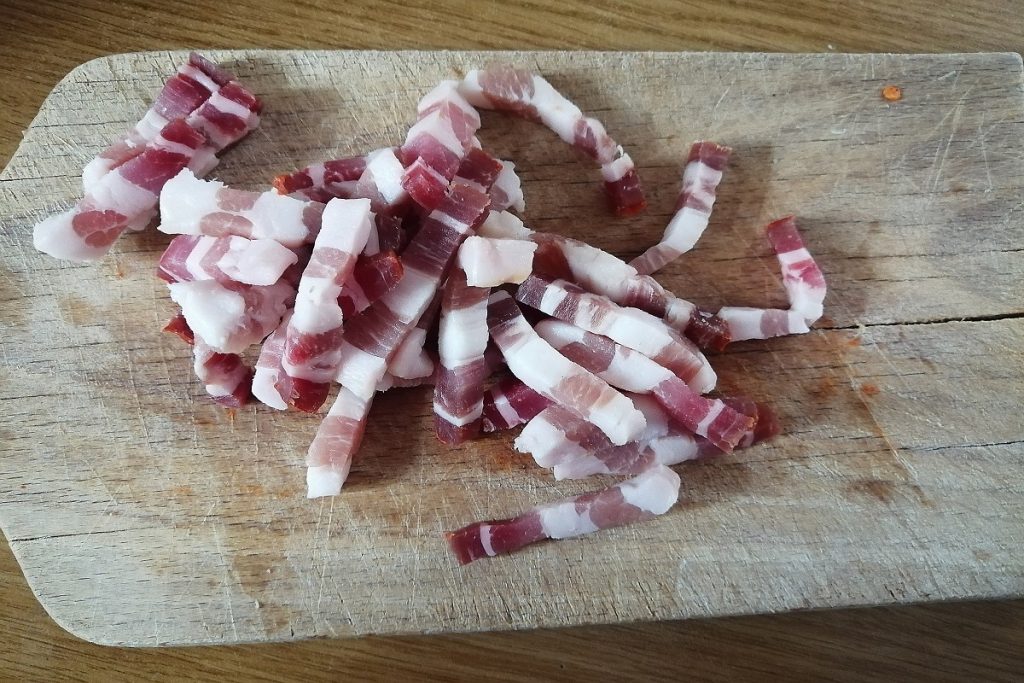 Den Speck in Streifen schneiden und, wenn Sie die Häppchen zubereiten möchten, den Speck in einer antihaftbeschichteten Pfanne ohne Öl braten, um ein knuspriges Ergebnis zu erzielen.