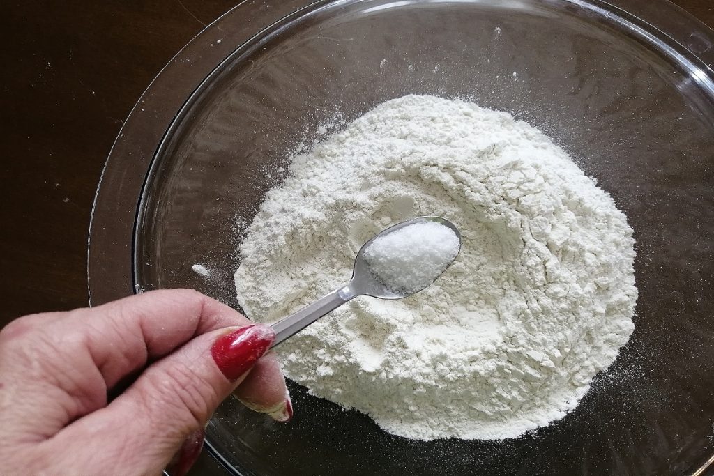 In einer Schüssel geben wir das Mehl und fügen den Teelöffel Salz und den Esslöffel Zucker hinzu.