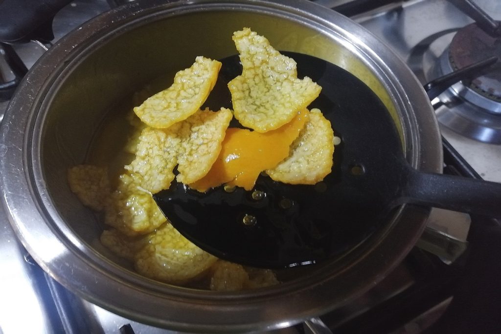 Für die Zubereitung der Cartellate geben wir den Weißwein und das Öl in einen Topf; fügen die Schalen von Bio-Mandarine hinzu und bringen es zum Kochen.