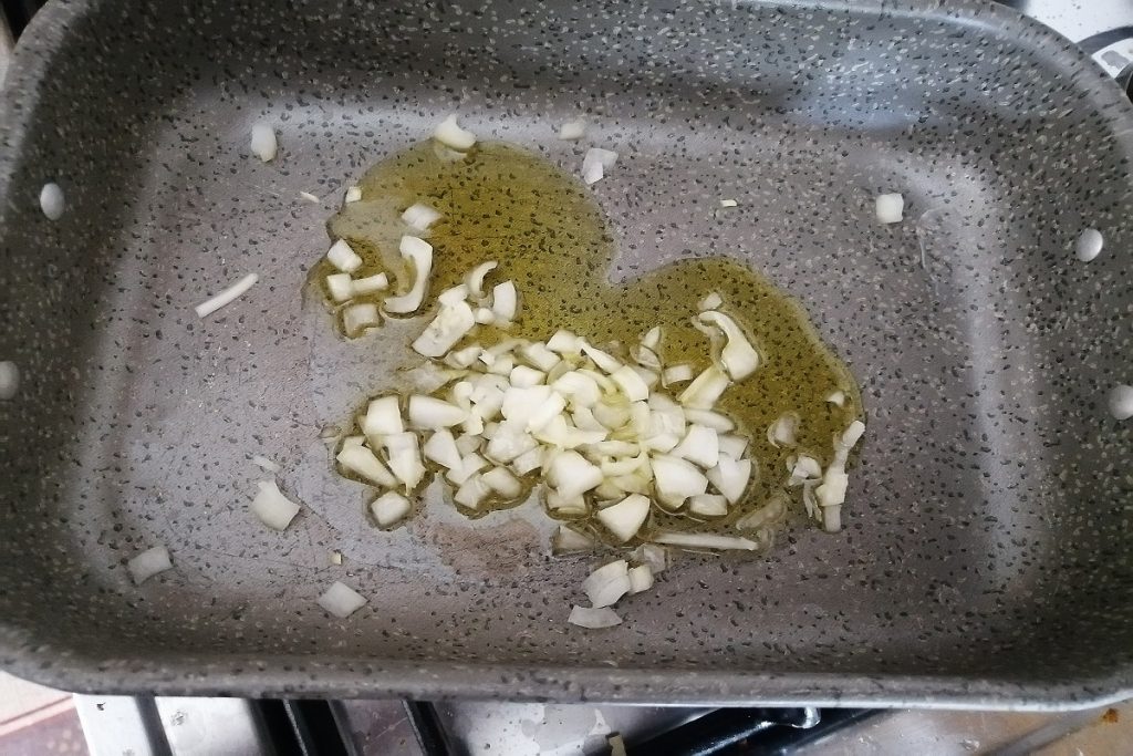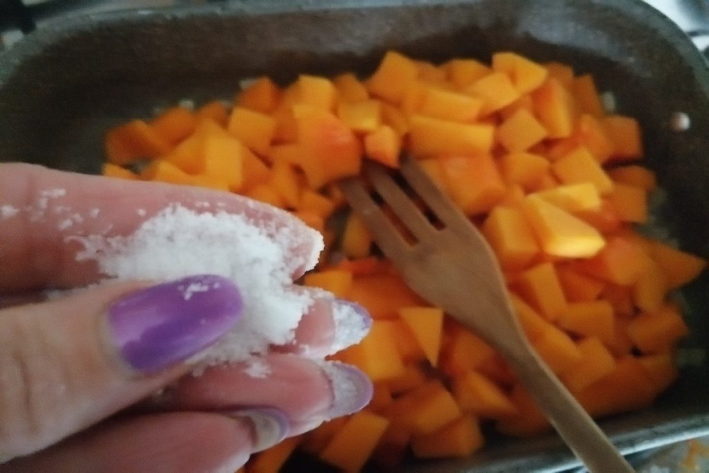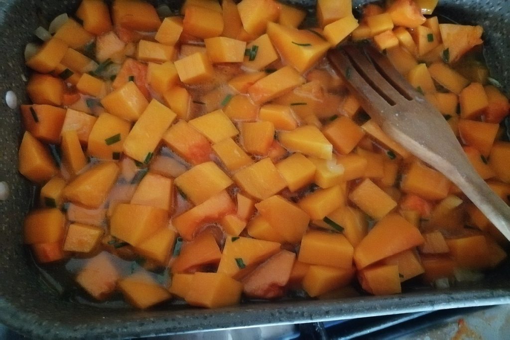 In einem Topf etwas EVO-Öl und die fein gehackte Zwiebel geben, bei schwacher Hitze anschwitzen lassen und die Kürbiswürfel hinzufügen.