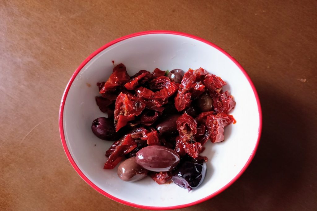Während der Reis kocht, schneiden Sie die getrockneten Tomaten in Öl in kleine Stücke, fügen Sie die ebenfalls abgetropften Taggiasche-Oliven hinzu.