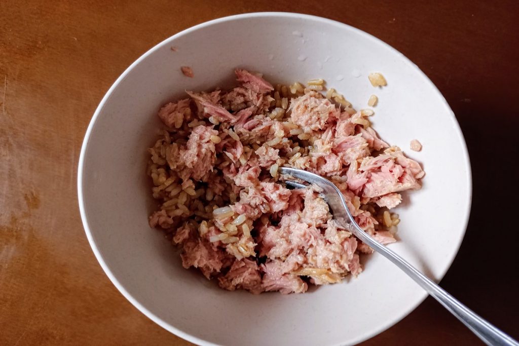 Fügen Sie dem Reis den Thunfisch aus der Dose hinzu, ich habe den Thunfisch in Natur verwendet für ein leichteres Gericht.