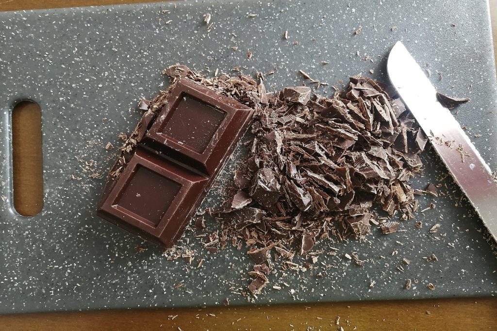 Die Schokolade mit einem Messer zerkleinern und im Mikrowellenherd für einige Sekunden oder im Wasserbad schmelzen.