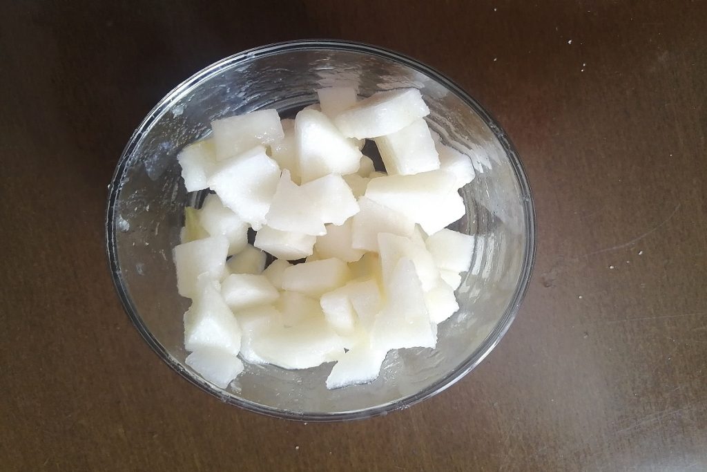 Schälen wir die Birne, entfernen das Kerngehäuse und schneiden sie in kleine Würfel.
