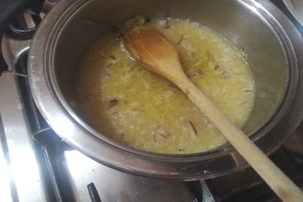In einem Topf gießen wir das EVO-Öl ein und geben die fein gehackte Zwiebel hinzu, lassen sie sanft weich werden.