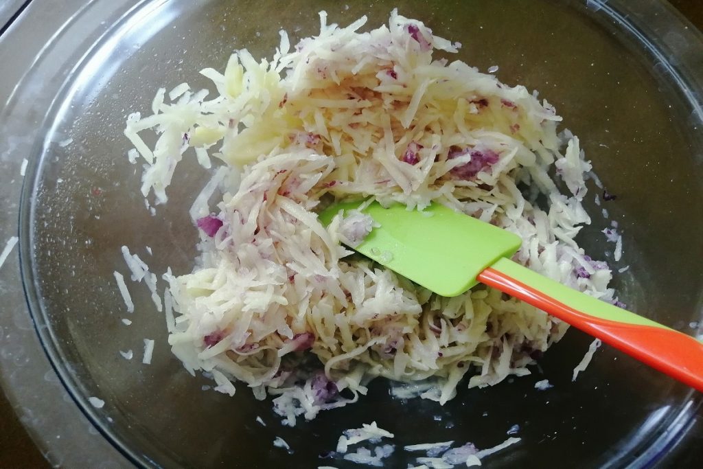 Gleiches Verfahren mit der Zwiebel, beide Zutaten zusammengeben und vermischen.