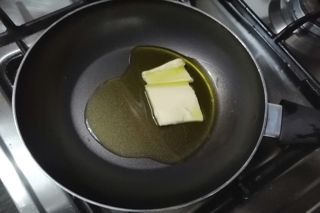In einer Pfanne geben wir etwas Olivenöl extra vergine hinzu und fügen das Stück Butter hinzu, lassen es schmelzen und geben dann die Schnitzel hinein.