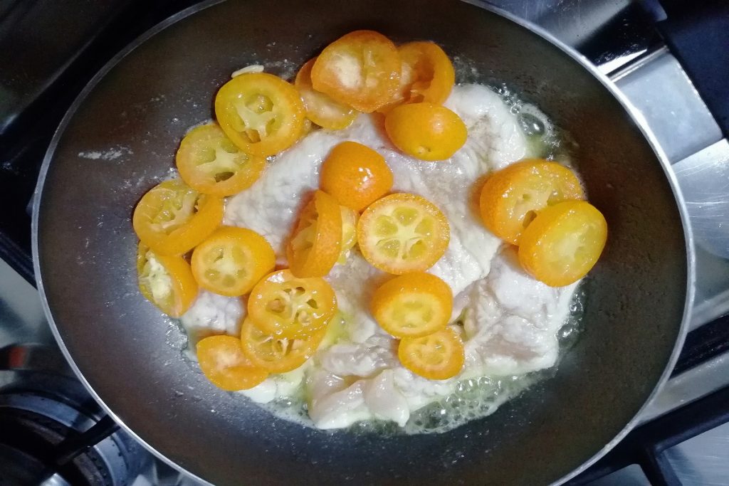 Wir waschen die Kumquats und schneiden sie in Scheiben, salzen und mehlen die Hähnchenbrust.