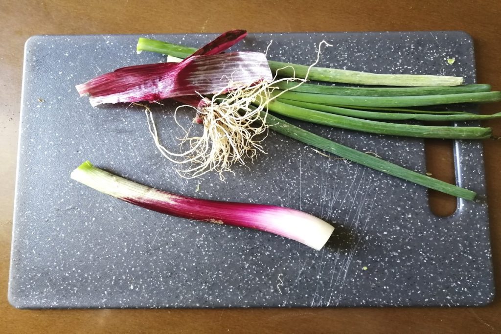 • Wir reinigen die Schalotte und schneiden sie in Ringe.
