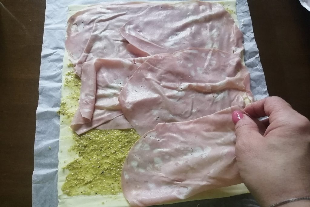 Darauf verteilen wir eine Schicht Pistazienpesto.