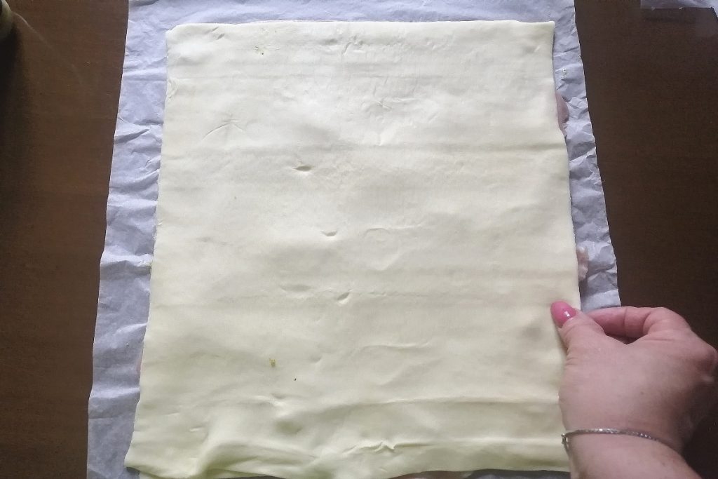 Wir öffnen die Blätterteigrolle und legen sie vertikal aus.