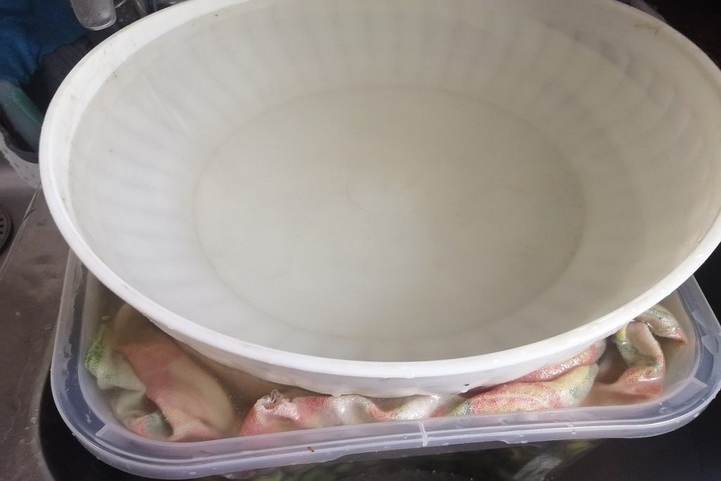Sobald alle Oliven zerdrückt sind, wechseln Sie das Wasser, bedecken Sie es mit einem sauberen Tuch und legen Sie ein Gewicht darauf, um die Oliven auf den Boden zu drücken.