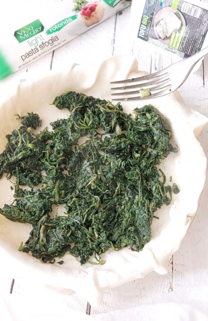 Für diesen Mürbeteig habe ich zarte, gekochte Feldkräuter verwendet, die in der Pfanne mit Knoblauch und Gewürzen angebraten und zwischen zwei Kreisen aus fertigem Blätterteig gelegt sowie mit ausgezeichnetem, zerdrücktem Tofu vermischt wurden.