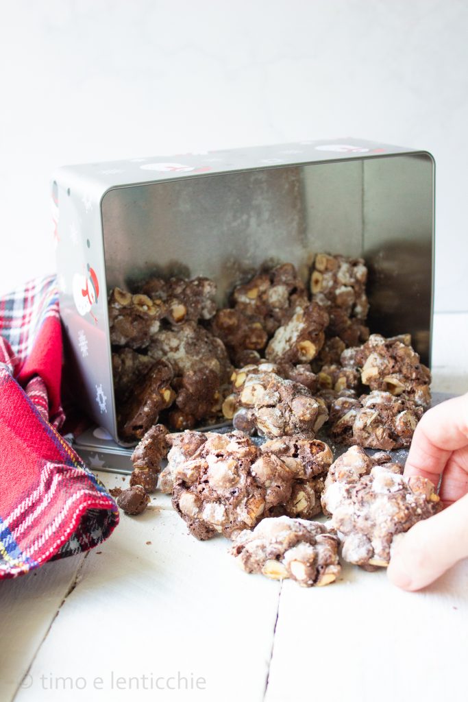 Ich habe das Rezept bei Erica Liverani gesehen, wo sie als „Schokoladen-Knochen zum Beißen“ bezeichnet werden. Ich war jedoch von der Menge an Puderzucker erschreckt, daher habe ich die Dosis halbiert. Ich hätte sogar noch weniger verwendet, aber es wird benötigt, um die Haselnüsse zusammenzuhalten, sonst zerbröseln sie alle.