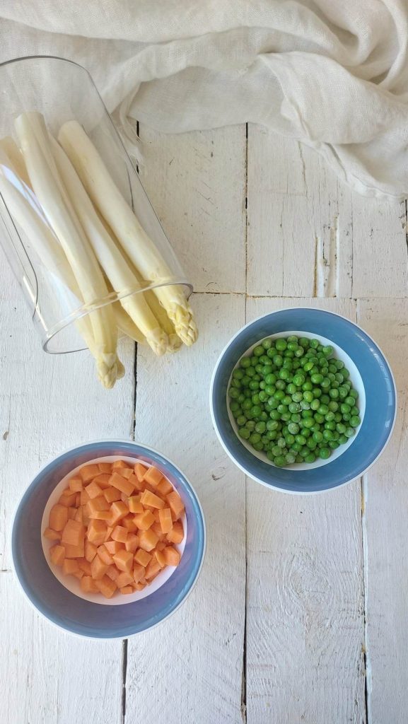 Wasche, schäle und würfle die Karotte. Dämpfe die Erbsen und die Karotte mit einer Prise Salz. Beiseite stellen.