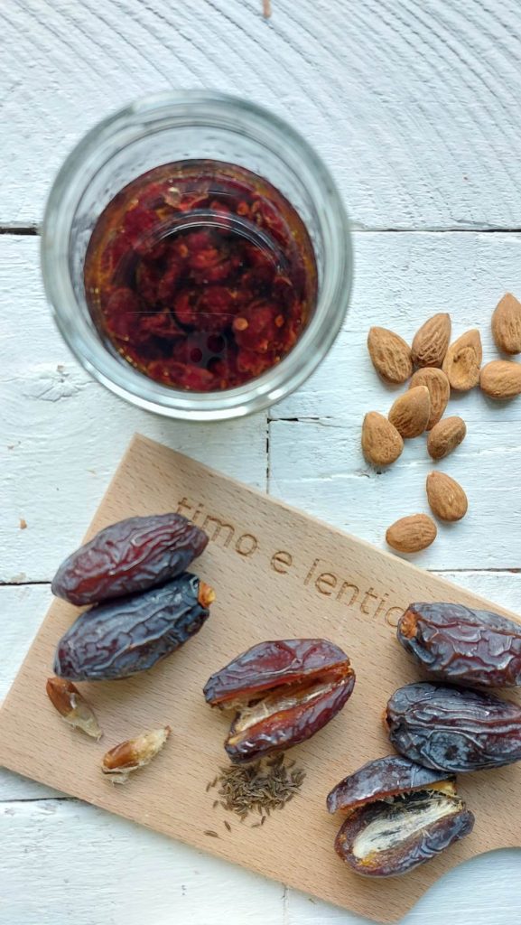 Weiche Rosinen und getrocknete Cranberries in Grappa ein. Schneide die Datteln in kleine Stücke.