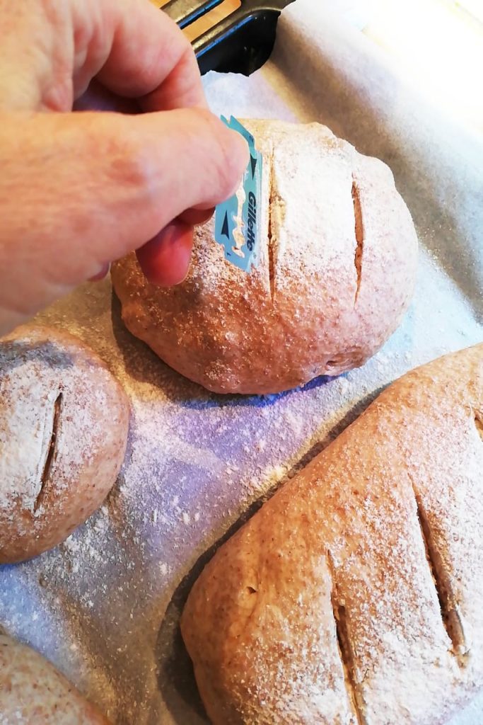 • Heize den Ofen auf 200 Grad Ober-/Unterhitze vor, bestäube die Brötchen vorsichtig mit Mehl und schneide sie mit einer Rasierklinge ein.
