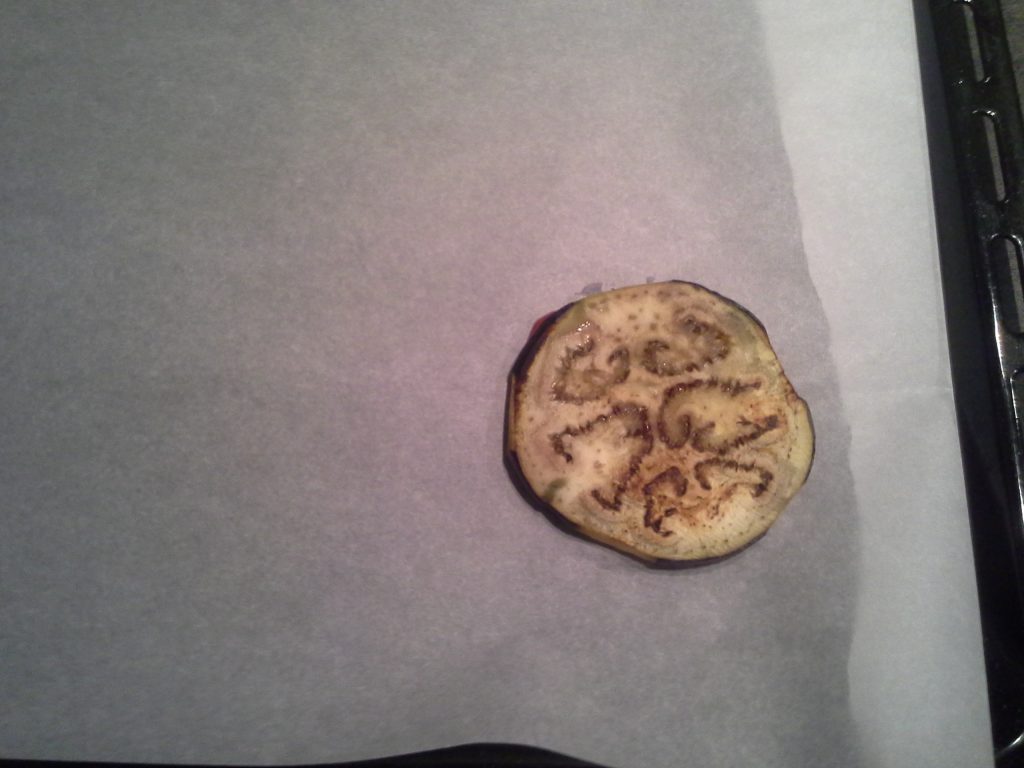 Nach dem Schälen der Aubergine schneide ich sie in zwei Hälften und von dort aus in etwa 1 cm dicke Scheiben.