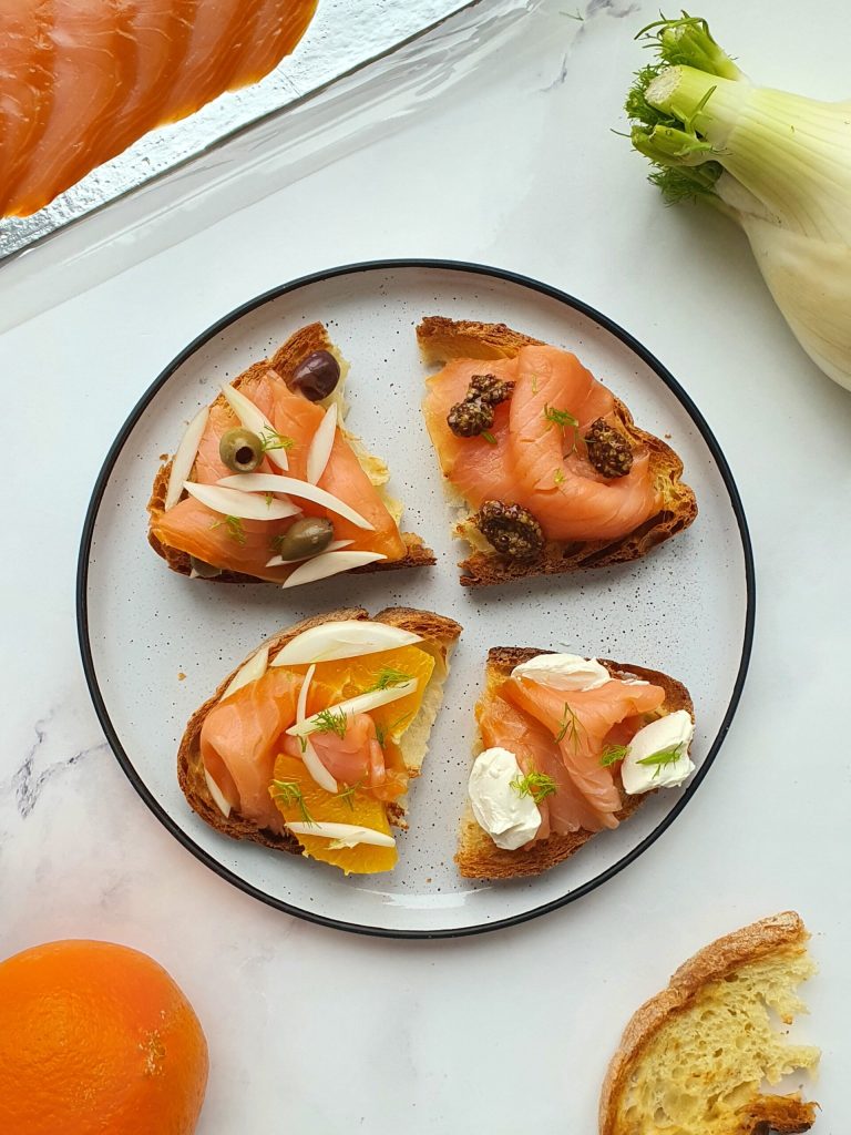• Auf einer zweiten Bruschetta, neben Lachs und Fenchel, füge Taggiasca-Oliven hinzu.