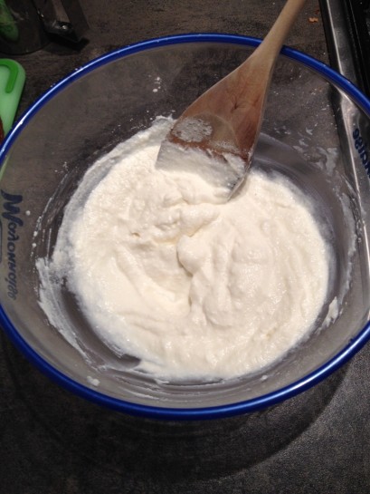• Fügen Sie den Rest der halbsteifen Sahne in die Schüssel mit dem Joghurt und der Sahne.