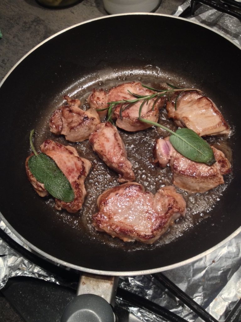 Für einen aromatischeren Geschmack können Sie einige Kräuter hinzufügen, um das Fleisch zu würzen (Salbei, Rosmarin). Drehen Sie das Fleisch auf die andere Seite und braten Sie es genauso lange wie auf der ersten Seite.