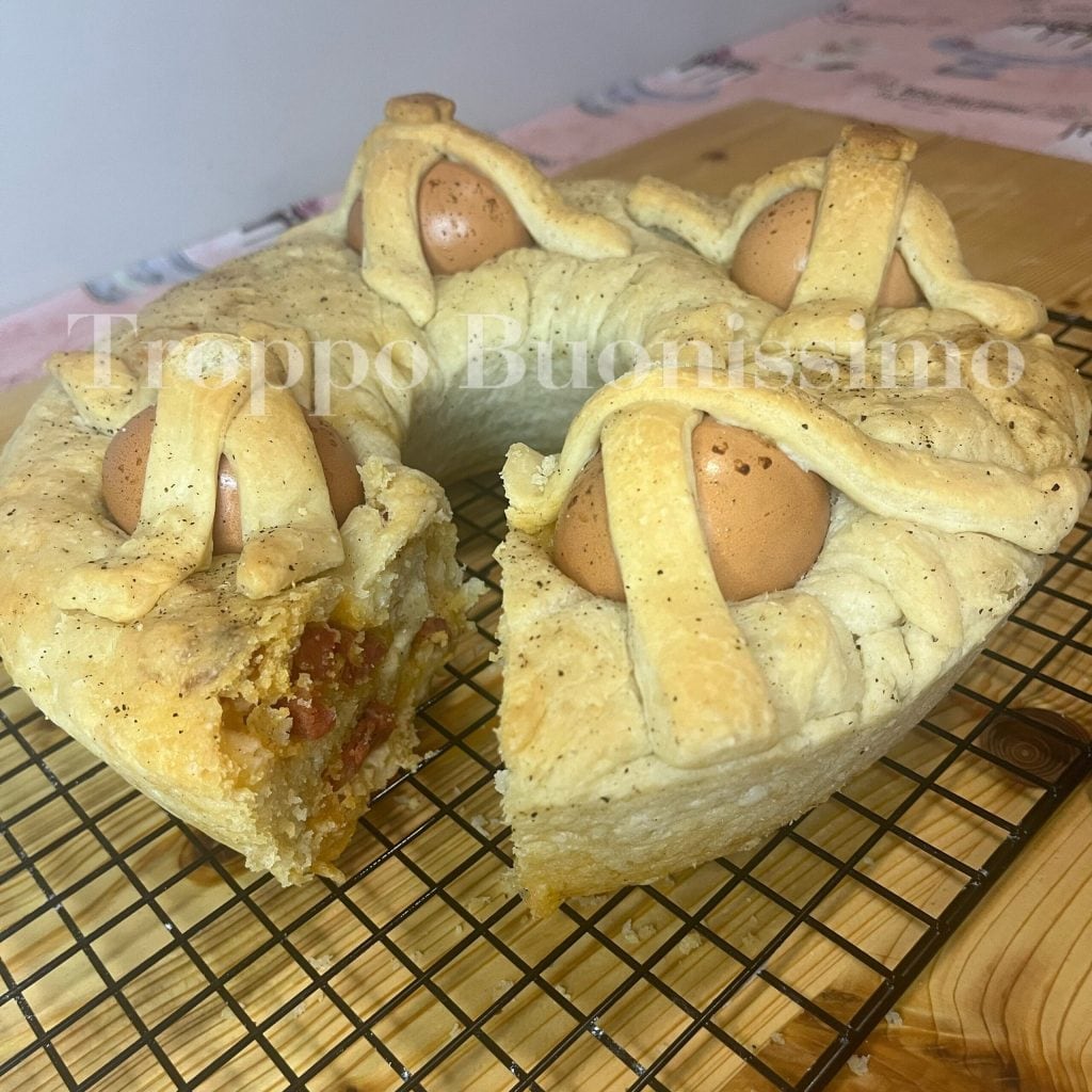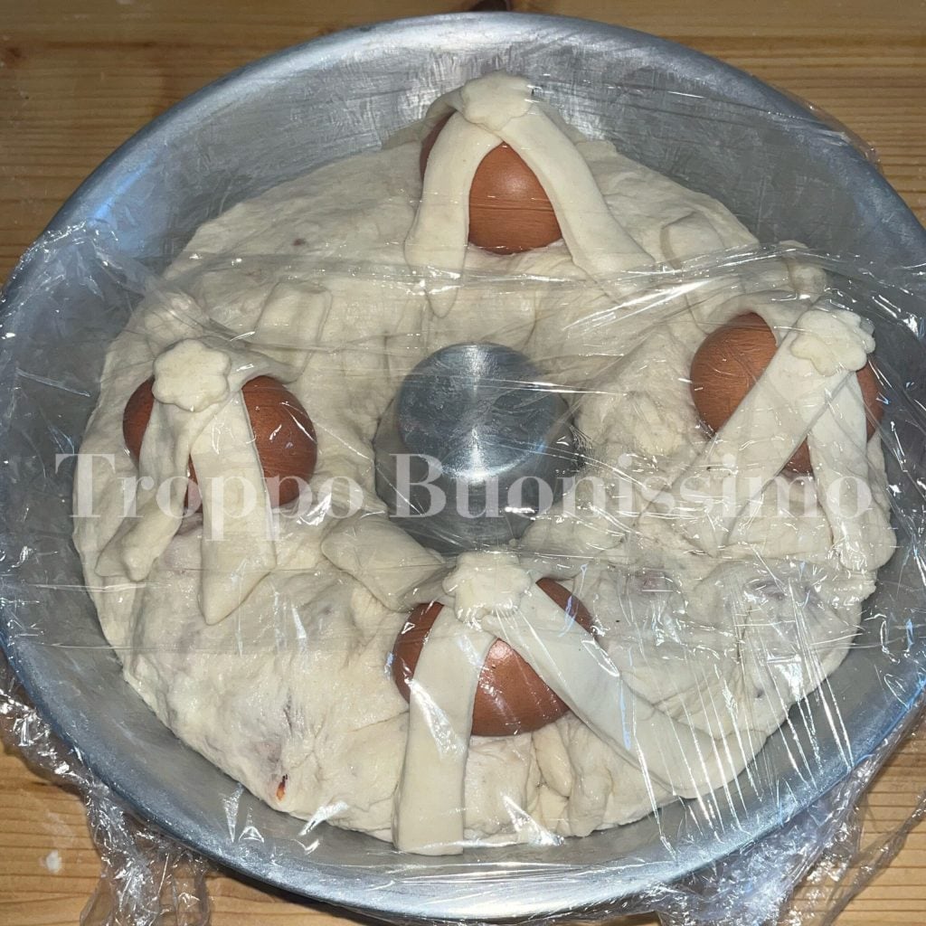Den erhaltenen Teig in eine zuvor mit Schmalz eingefettete Form legen und nach gründlichem Waschen der Eier diese abtrocknen und sanft in den Teig einsetzen. Das beiseitegelegte Teigstück nehmen und 8 Streifen formen, dann kreuzweise über jedes Ei legen, die Enden leicht andrücken, damit sie haften. Mit Frischhaltefolie abdecken und weitere 30 Minuten gehen lassen.