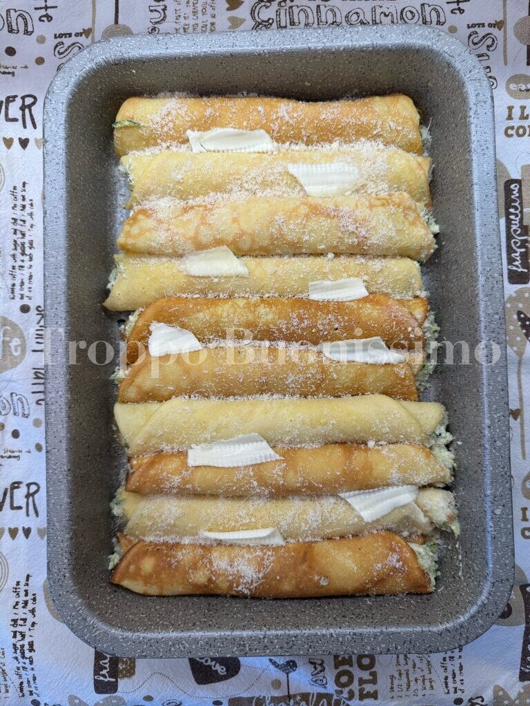Nimm eine Crêpe und streiche mit einem Spritzbeutel oder Löffel etwas Füllung darauf, rolle sie dann auf. Wiederhole den Vorgang für die anderen Crêpes. Fette eine Ofenform mit etwas Butter ein, lege die gerollten Crêpes nebeneinander hinein, füge einige Butterflocken und etwas geriebenen Parmesan hinzu.