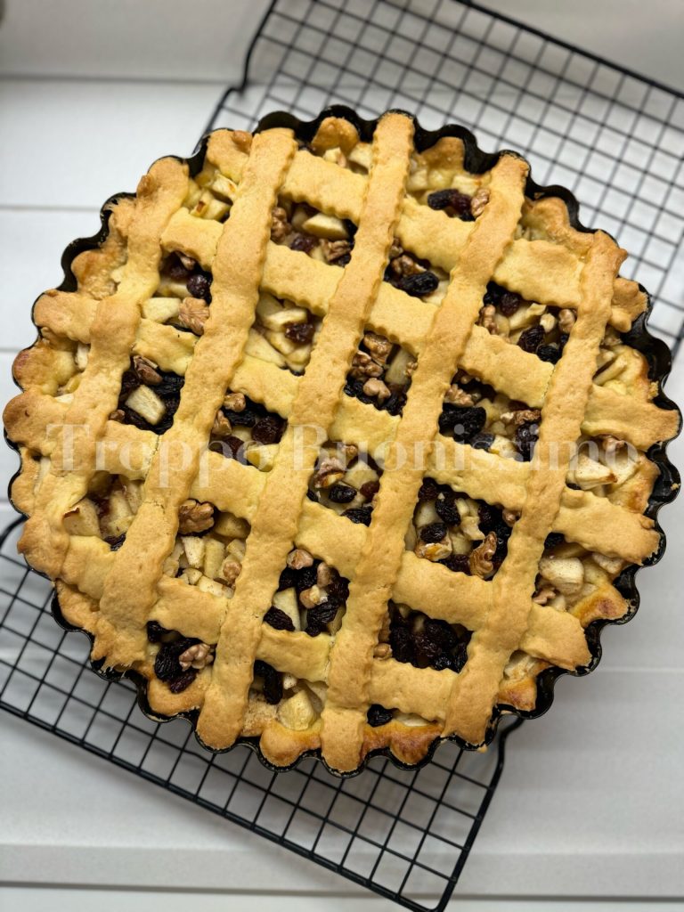 Der gedeckte Apfelkuchen mit Zimt, Rosinen und Walnüssen ist ein Dessert, das die Aromen des Herbstes wachruft, perfekt zum Tee oder als Nachtisch nach dem Essen. Die Süße der Äpfel verbindet sich mit dem Zitronensaft und dem Duft von Zimt, während die eingeweichten Rosinen eine zuckerhaltige Note hinzufügen. Die Walnüsse mit ihrer Knusprigkeit vervollständigen alles und bieten eine einzigartige Konsistenz.