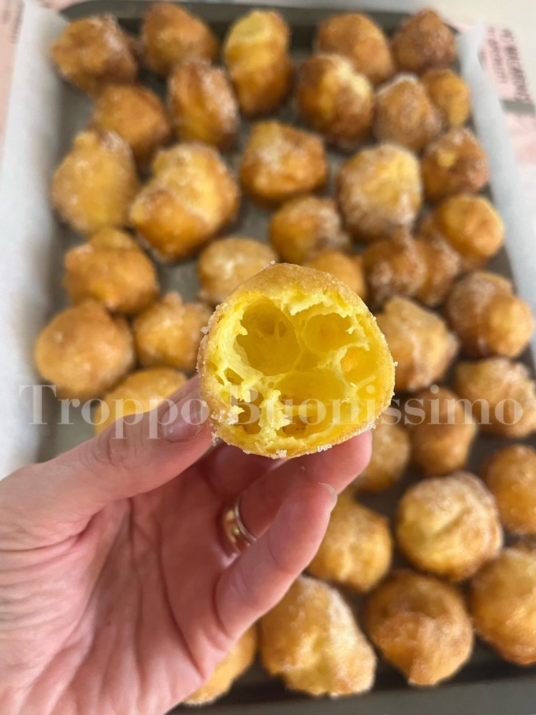 Forme die Krapfen mit Hilfe von zwei Löffeln oder fülle den Teig in einen Spritzbeutel und forme auf einem mit Backpapier vorbereiteten Blech Bällchen von etwa 3/4 cm Durchmesser mit ausreichend Abstand.
