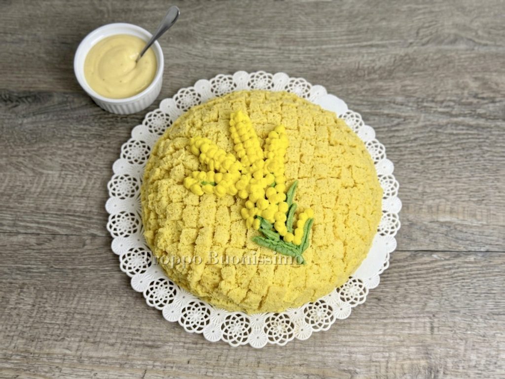 Die Mimosa-Torte ist ein Klassiker der italienischen Patisserie, Symbol des Internationalen Frauentags und perfekt für besondere Anlässe. Ihr Name kommt vom weichen, zarten Aussehen, das an Mimoseblüten erinnert, dank der Überzugsschicht aus zerbröseltem Biskuit (Pan di Spagna). Diese verführerische und eindrucksvolle Torte besteht aus Schichten weichem Biskuitteig (Pan di Spagna), gefüllt mit einer samtigen Diplomatencreme auf Basis von Puddingcreme und geschlagener Sahne.