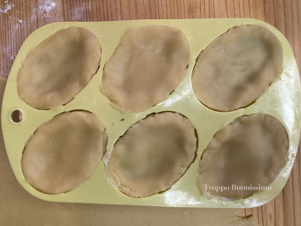 Ein Teigstück formen, in Frischhaltefolie wickeln und mindestens 30 Minuten im Kühlschrank ruhen lassen.Eine kleine Portion Mürbeteig nehmen und die Vertiefungen der Silikonform einzeln auskleiden, dabei die Ränder gut andrücken.