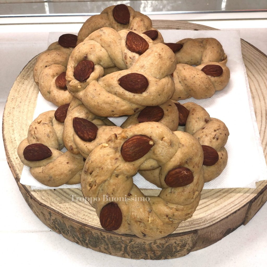 Das leichte Befeuchten sorgt dafür, dass die Mandeln besser an den Taralli haften und sich beim Backen nicht lösen.