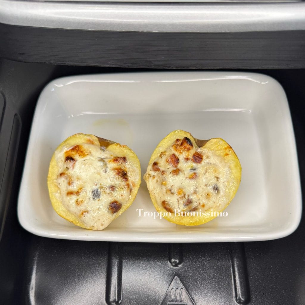 Lege die gefüllten Äpfel in den Korb der Heißluftfritteuse. Bei 180°C etwa 10-15 Minuten backen, oder bis die Äpfel weich und an der Oberfläche goldbraun sind.
