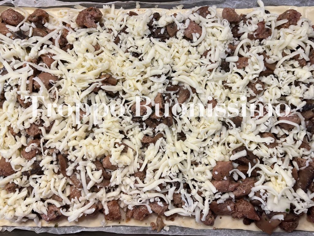 Verteile die Wurststücke und die Pilze gleichmäßig auf dem Pizzaboden. Füge oben den geriebenen Provola-Käse hinzu (mit einer groben Reibe).