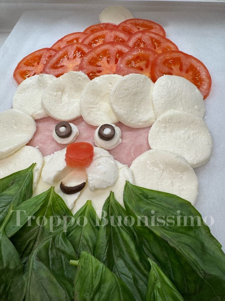 Füge eine Scheibe gekochten Schinken hinzu, um das Gesicht zu formen, lege die Mozzarella drumherum, nutze eine Scheibe, um den Bommel des Hutes zu formen und eine für den Schnurrbart (teile sie vorher in zwei), und widme dich schließlich Augen, Nase und Mund.Für den Bart ordne die Basilikumblätter am Boden an, um einen voluminösen Effekt zu erzeugen. Jetzt ist dein Weihnachtsmann bereit, serviert zu werden!