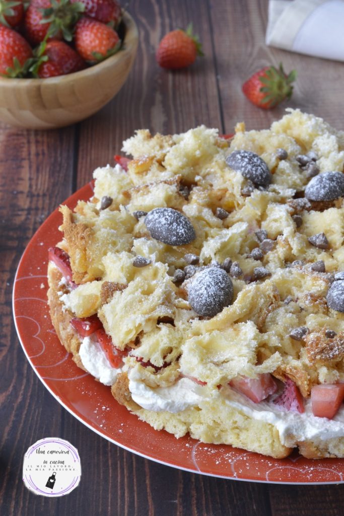 Der Bröselkuchen aus Colomba mit Sahne und Erdbeeren ist eine einfache und leckere Idee, um eines der traditionellen Osternachspeisen, nämlich den Colomba, zu verwerten. Ein Kuchen aus weichen Colomba-Scheiben, die zur Basis des Kuchens werden, getränkt mit einem Erdbeerlikör, wird mit einer Schicht Schlagsahne und frischen Erdbeerstücken bedeckt. Dekoriert dann mit Schokoladenstückchen und Eiern.