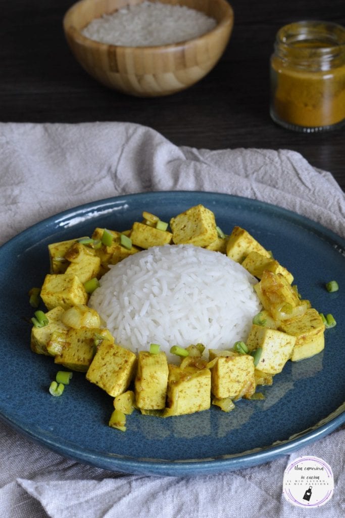 Das Curry-Tofu mit Reis ist ein veganes Hauptgericht, einfach, schnell und duftend. Goldene Tofuwürfel (eine auf Soja basierende Zubereitung), werden einfach in der Pfanne mit Curry, einer sehr aromatischen und duftenden Gewürzmischung, gebraten. Für dieses Rezept habe ich mich entschieden, es mit Basmati-Reis zu begleiten, der lange und dünne Körner hat. Sie können das Gericht mit Ihrem bevorzugten Gemüse bereichern, wie zum Beispiel mit gewürfeltem Pfannengemüse.