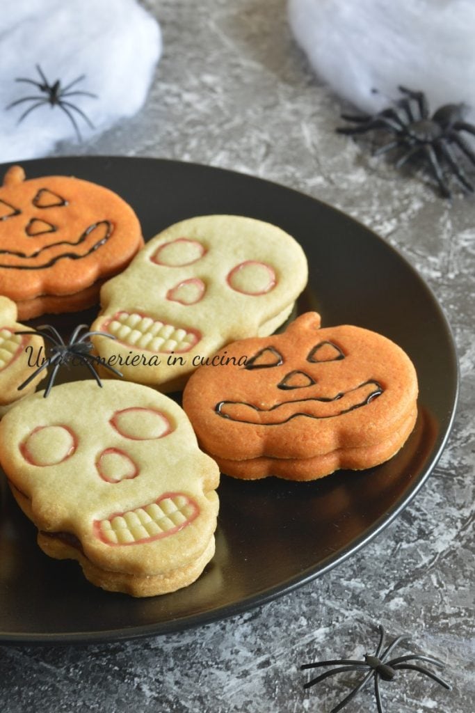 Nehmen Sie dann 5 Totenkopf-Kekse und bestreichen Sie sie mit Erdbeermarmelade, decken Sie sie mit den anderen 5 leicht pressend.