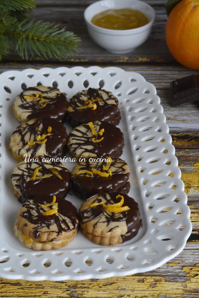 Die Gewürzkekse mit Orangenmarmelade und Schokolade sind lecker und duftend, gedacht für die Weihnachtszeit, aber nicht nur. Köstliche Mürbeteigkekse, gewürzt mit Gewürzen wie Zimt, Nelken und Ingwer, enthalten eine Füllung aus Orangenmarmelade und sind mit Zartbitterschokolade und Orangenschale überzogen. Eine Kombination, die an den Herbst und Winter erinnert. Ideal zum Nachmittagstee oder nach den Mahlzeiten, auch zum Frühstück geeignet und warum nicht, auch als Geschenk.